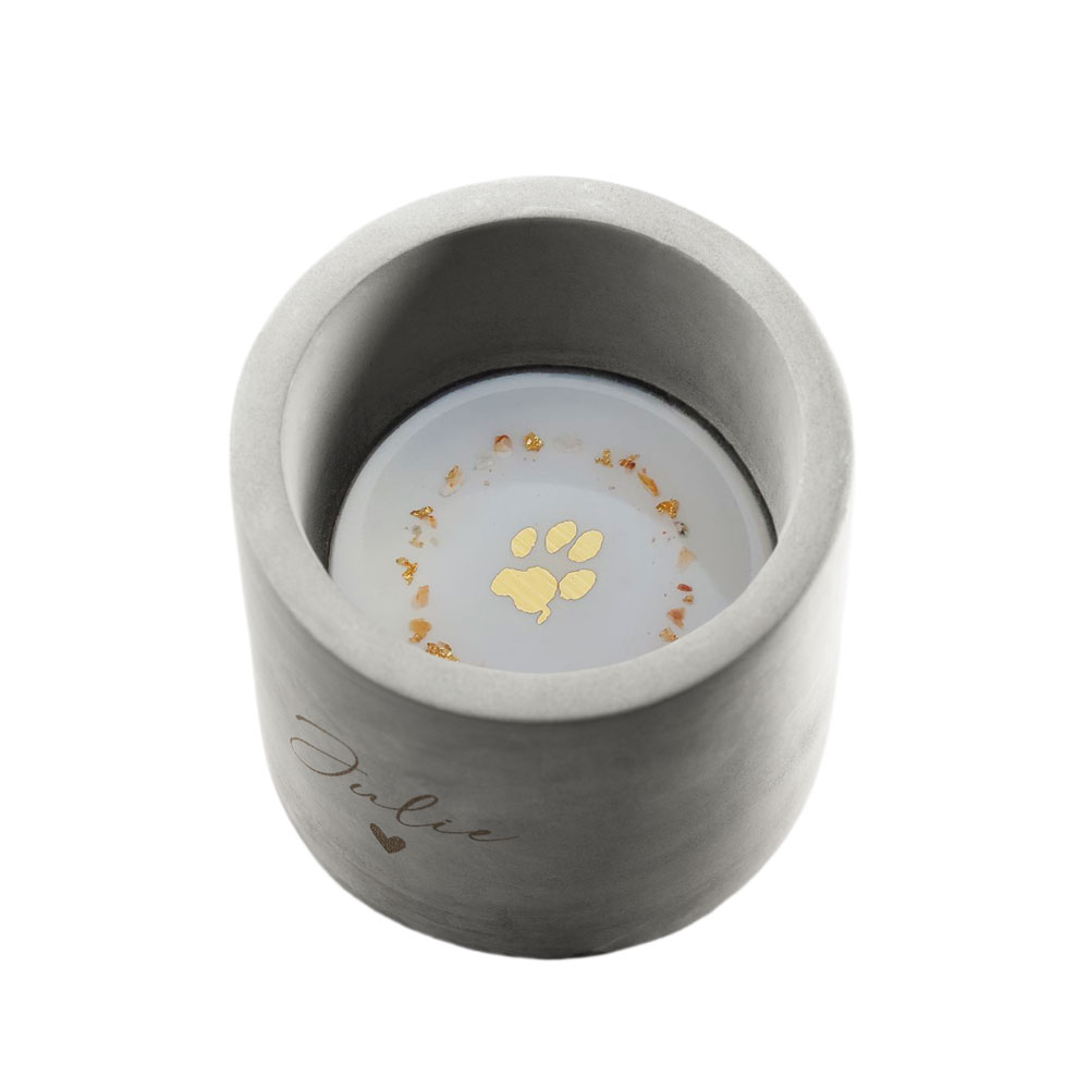 In Handarbeit arbeiten wir Aschepartikel deines Haustiers in den Teelichthalter ein. In mehreren Schichten tragen wir Kunstharz in den Betonsockel, bis am Ende ein wunderschöner und vollkommen individueller Teelichthalter entsteht, der dich an dein Tier erinnert.